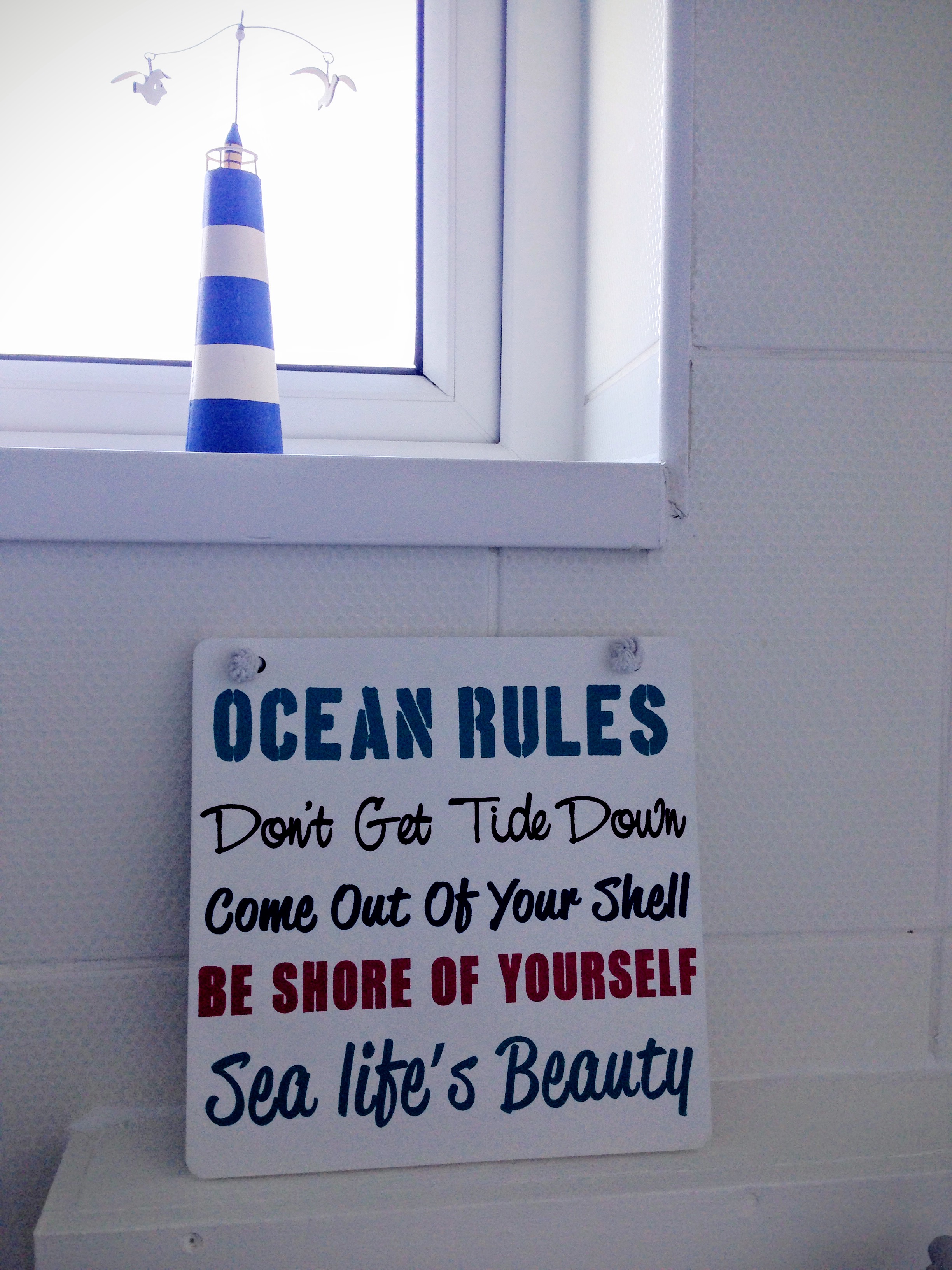 I thought this was the perfect sign to have in my seaside themed bathroom. Aside from the great puns, I like looking at these words every morning and evening when I’m cleaning my teeth – very wise words to think about!